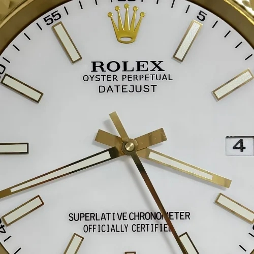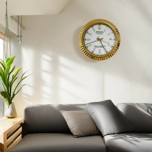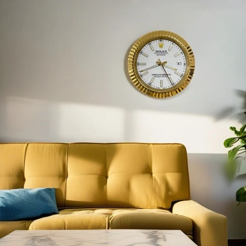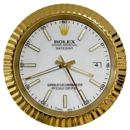 Inspired by the classic Rolex Date-Just aesthetic, this luxury wall clock blends elegance with precision. Designed in a gold-and-white presidential style, it features a refined white dial, a polished golden fluted bezel, and luminous hour markers that enhance visibility day and night.