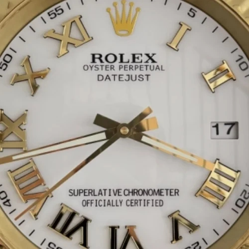 Bring classic elegance into your space with this 34 cm Date-Just wall clock featuring a gold-and-white Roman dial, luminous hands, and a silent sweep movement — a refined décor piece for any room.