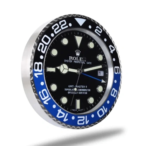 This model is Rolex-inspired in design language, celebrating the heritage of iconic GMT timepieces while serving as a functional and decorative wall clock.