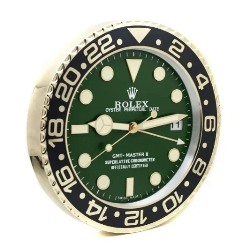 Bring bold elegance and iconic sport-luxury character into your space with this 34 cm GMT Master II wall clock, featuring a striking green dial paired with a gold bezel. Inspired by legendary professional travel watches, this piece blends classic watch aesthetics with modern interior décor.